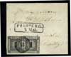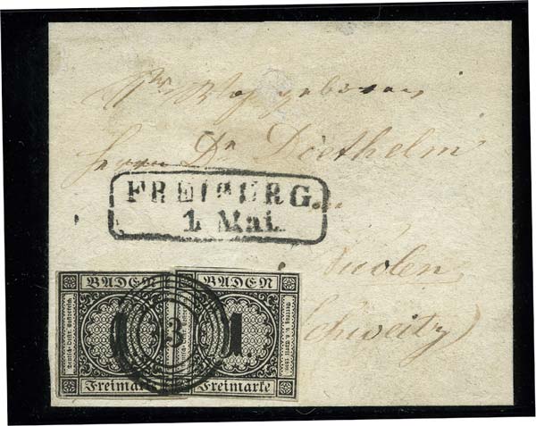 Michel N°5 - 1 k. noir -, 2 ex. margés avec obl. centrale idéale sur une bande complète pour imprimé envoyé de Freibourg le 1 Mai (58), griffe encadrée, à destination de Lachenen Suisse. Hors Ligne. |