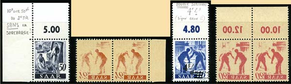 1920-1927: Etude des fausses surcharges, n°28, 29 et 31 signés Dr Dub et Brun + diverses bonnes séries + variétés (impression de la surcharge sur bord de feuille, surcharge décalée, dentelure décalée,... Superbe lot. Joint: "Les premières surcharges de la Sarre" par Lutz (1925). |