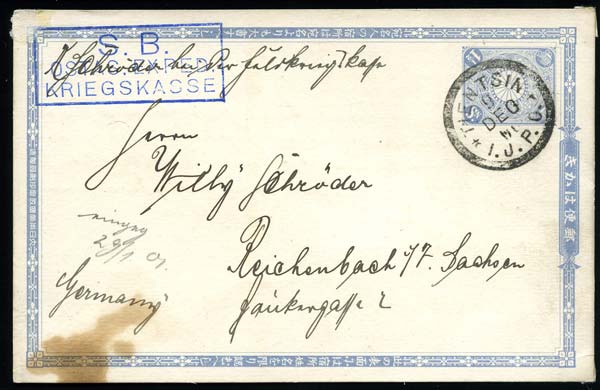 Entier du Japon obl. "Tientsin 9/12/00" avec cachet "S.B./OSTAS. EXPED./KRIEGSKASSE". Petite tache sinon TB. |