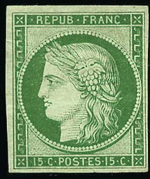 N°R2 (Cérès) -15 c. vert-, neuf avec gomme altérée. Certificat Roumet. TB. Cat. 700 euros. |