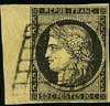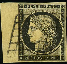 N°3 -20 c. noir sur chamois-, grandes marges et grand bord de feuille gauche, obl. grille sans fin. Hors Ligne. |
