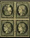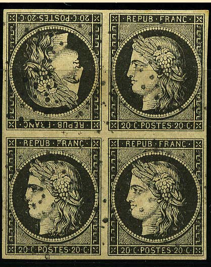 N°3d -20 c. noir sur jaune-, tête-bêche dans un bloc de 4. Tirage postérieur à l'émission avec annulation petite étoile. Rare et TB. Cert. P. Scheller. |