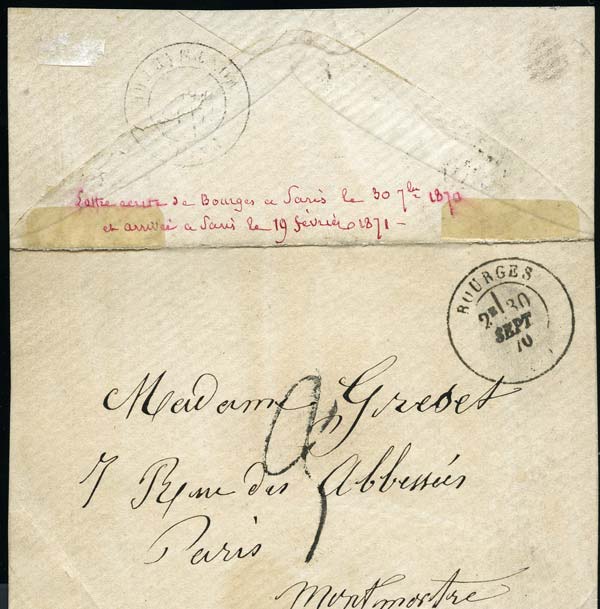 Lettre de Bourges envoyée le 30 sept. 1870 à Paris où elle n'arrive que le 17 févr. 1871, donc après le siège. Document intéressant. |