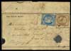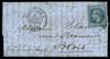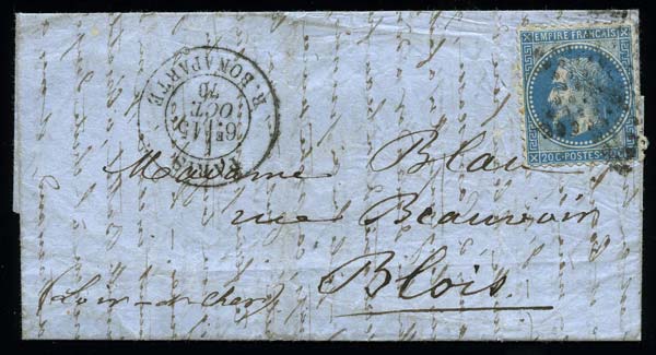 N°19 -20 c. bleu- sur une lettre envoyée le 15 oct. 1870 de la rue Bonaparte à Blois où elle arrive le 20. TB. |