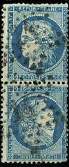 N°60Ab -25 c. bleu-, tête-bêche vertical, dentelure légèrement défectueuse en haut et en bas. CY. 4500 euros. |