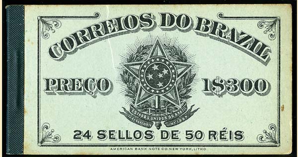 1906- Carnet de 1$300, couverture vert clair (petite déchirure en haut), comprenant 4 panneaux de 6 du 50 reis vert (qqs timbres jaunis et trace de plis). Scott 176a, Rogers n°1. Cat. 600 usd. |
