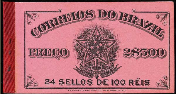 1906- Carnet de 2$500, couverture rose comprenant 4 panneaux de 6 du 100 reis rose. Scott 177b, Rogers n°2. Cat. 990 usd. Rare et superbe. |