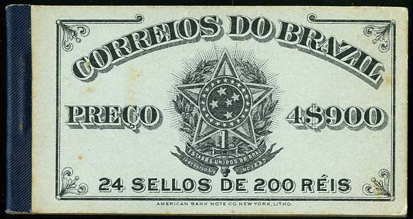1906- Carnet de 4$900, couverture bleu clair, comprenant 4 panneaux de 6 du 200 reis bleu (qqs timbres huileux). Scott 178a, Rogers n°3. Cat. 918 usd. |