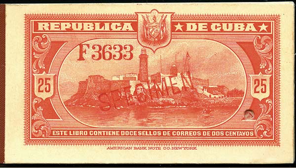 1910- carnet de 25 c. couverture rouge comprenant 2 panneaux de 6 du 2 c. rouge, surcharges "specimen" et perforés. Scott 248a, Rogers 6b. Cat. 918 usd. Rare et superbe. |