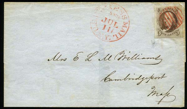 N°1 -5 c. brun-, marges maxima (2 voisins), superbe obl. grille rouge sur une lettre (manque un rabat au verso) avec c. à d. rouge "US EXPRESS MAIL N.Y JUL III". Splendide. CY.1000 euros. |