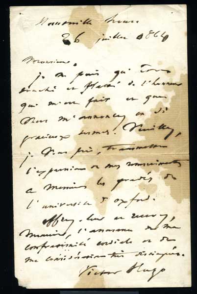 Victor Hugo: Texte de 14 lignes daté et signé du 26 juillet 1864. |