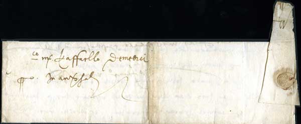 1520- Pli daté d'Anvers et adressé en ville à Rafael de Medicis le 20 sept. par messager. Marque "pp" (port payé). Le pli est avec bandelette de fermeture intacte (rare). Superbe. |