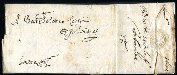 1601- Pli daté "Anvers 11 juillet" envoyé à Bartholomeo Corsini à Londres où elle arrive le 22 juillet. "pq" (per questa) par le Merchant Strangers Post. Au verso, cordelette de fermeture et sceau de fermeture avec "T" de Ottavio Tibante, l'expéditeur. Superbe. |