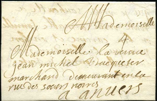 1713- Pli daté "Lille 23 fév." adressée "rue des Soeurs noirs" à Anvers. Port: "4" stuivers (tarif du 1/11/1701). Rare avec nom de rue. Superbe. |