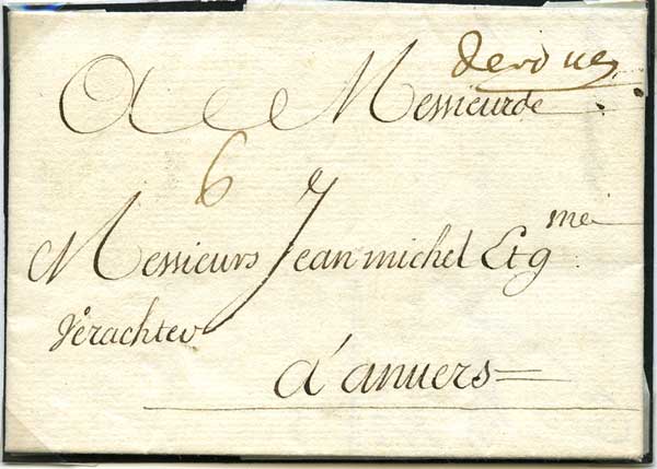 1715- Pli daté "de Rouen" envoyé le 29 mars à destination d'Anvers. Port: "6" (stuivers). Superbe. |