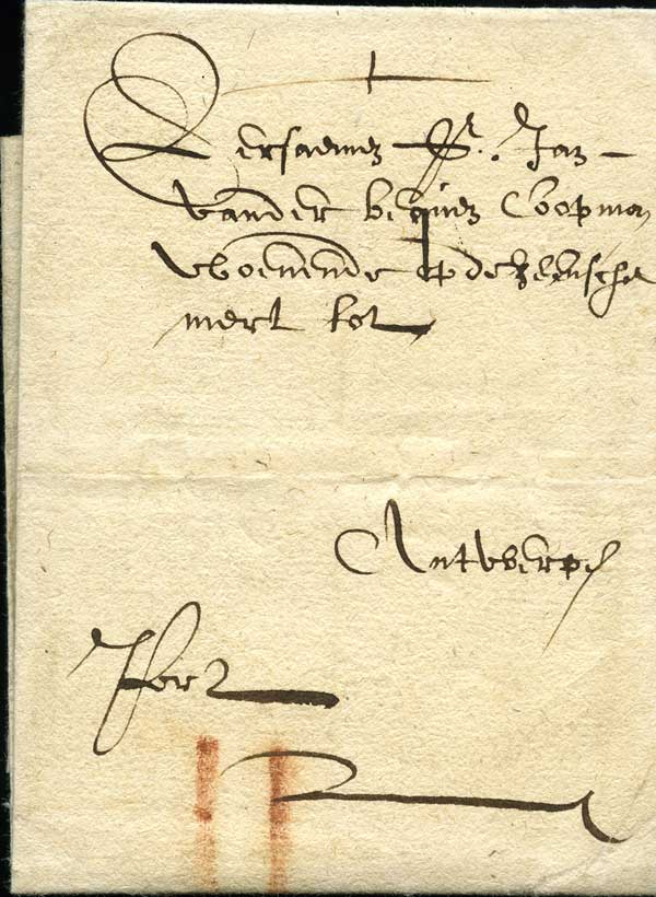 1599- Lettre commerciale datée d'Anvers du 19 nov., adressée à Filipo et Bartolomé Corsini à Firenze avec mention manuscrite "Franca sino a Montova" (franco jusqu'à Mantova). Rare et superbe. |