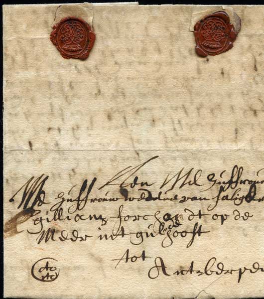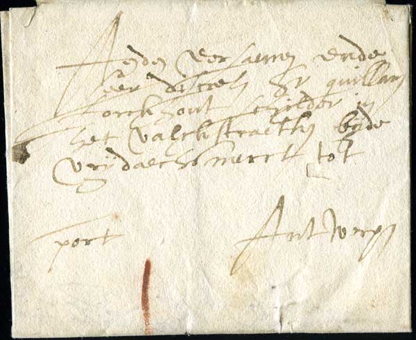 1639- Pli de "Laus Deo 12 janv." à destination d'Anvers avec descriptif de l'adresse "Valck Straete bij de vrijdag merct". Port: "I" (sol) à la craie. Superbe. |