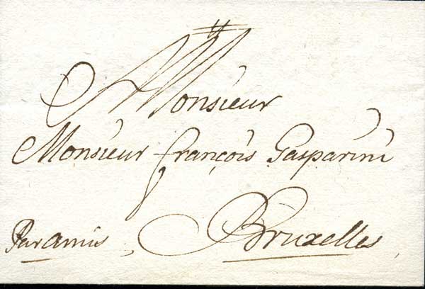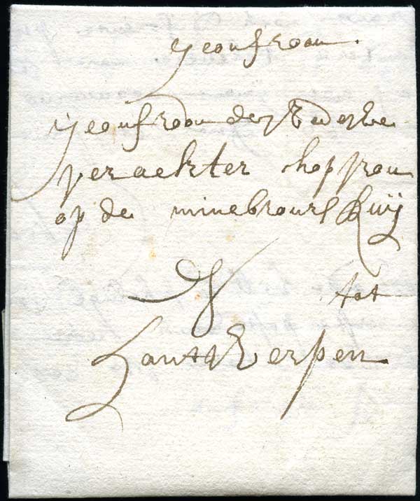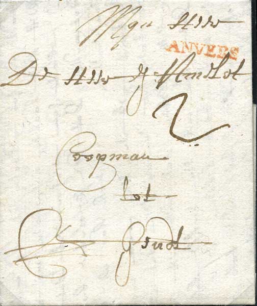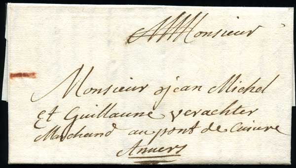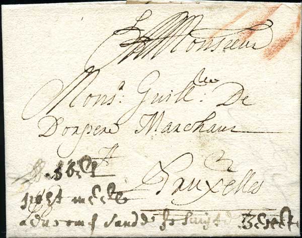 1695- Pli avec griffe "d'Anvers" vers Bruxelles le 30 juil. Port: "2" (stuivers). Superbe. |