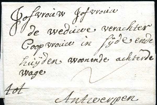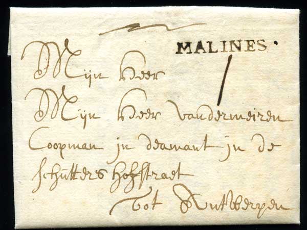 1742- pli de Malines (griffe d'origine) du 21 oct. envoyé à destination d'Anvers avec descriptif de l'adresse "In de Schutters Hofstraat". Port: "I" (1 stuiver). Superbe. |