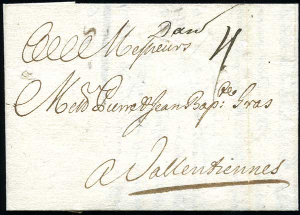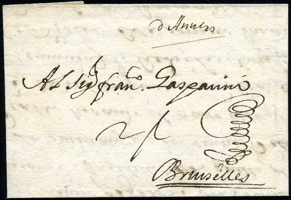 1697- Pli avec griffe d'origine "Dan" d'Anvers du 9 déc. vers Valenciennes. Port: "4" (patars). Superbe. |