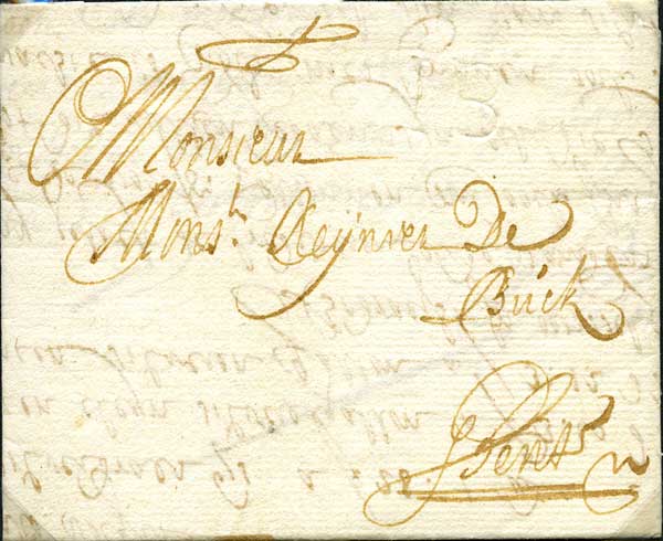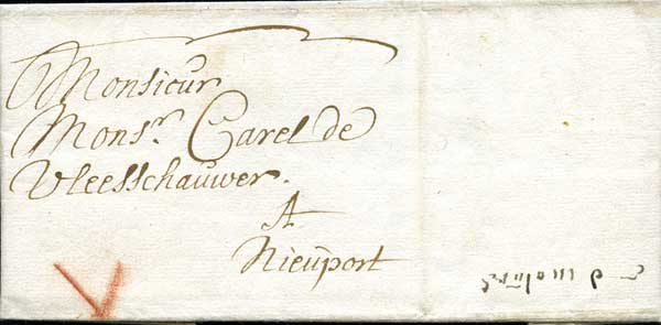1695- Plis d'Anvers du 7 oct. envoyé à Nieupoort. Port: "V" (5 stuivers) à la craie. Au verso: "g. Capay", nom du messager. Superbe. |