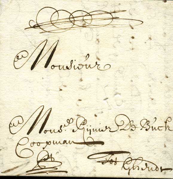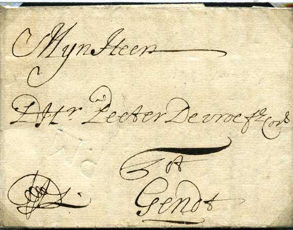 1695- Pli d'Anvers à Gand du 29 oct. avec marque de messager "IB" en creux et à sec. Superbe. |