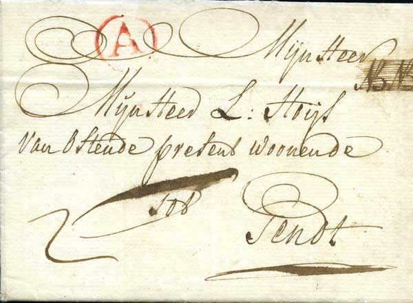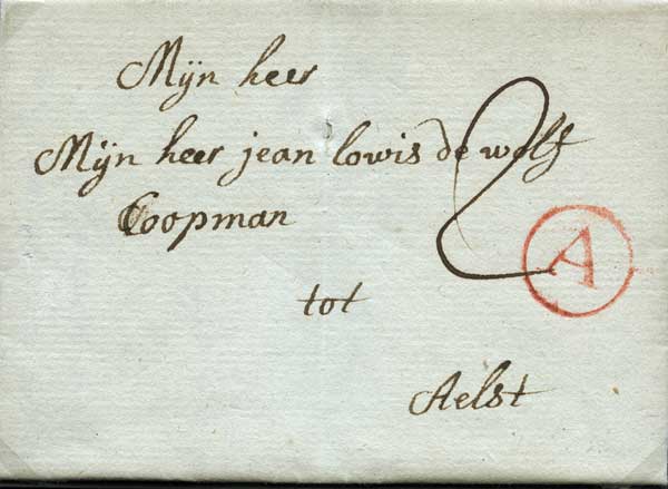 1782- Pli d'Anvers ("A" dans un cercle) à Aalst. Port: "2"(stuivers). Superbe. |