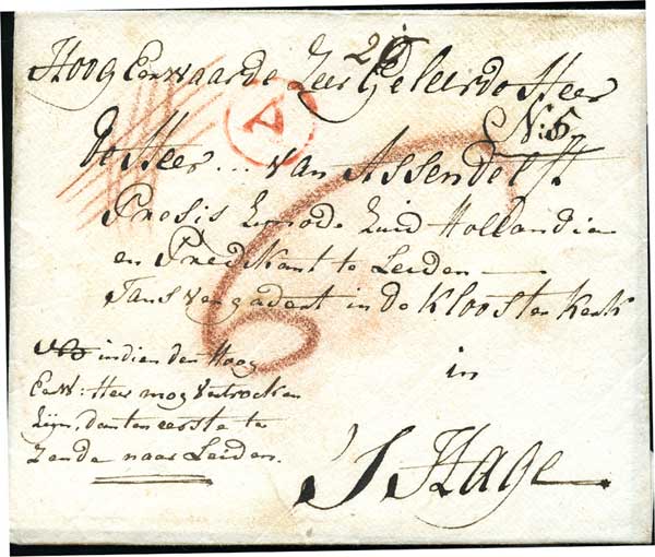 1787- Pli d'Anvers ("A" dans un cercle) à 'S Gravenhage (Pays-Bas) du 9 juillet envoyé en rec. (2 x 4 lignes s'entrecroisant à la craie). Port: "6" (stuivers). Mention: "NB indien Den Haag/Eerst: Hier mag vertrocken/ sijn, dan ten eerste te/zenden naar Leiden". Splendide. |