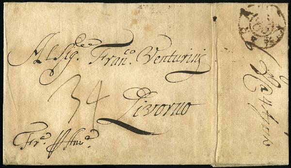 1684- Lettre du 23 juin de Londres pour Livourne portant la mention manuscrite "Frc° p Anv a", payée 6 pences au verso, masqué par le cachet à double cercle "Franche" (surcharge obligatoire pour cacher ce dit port aux maîtres des Postes à l'étranger). Certificat Vanderlinden. Rare et superbe. |