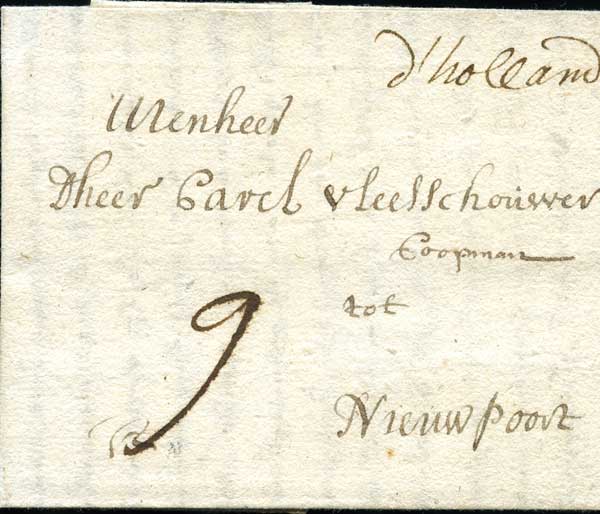 1709- Pli du 25 août de Maassluis (griffe d'Holland) vers Nieuwpoort via Anvers. Port: "9" (stuivers). Superbe. |