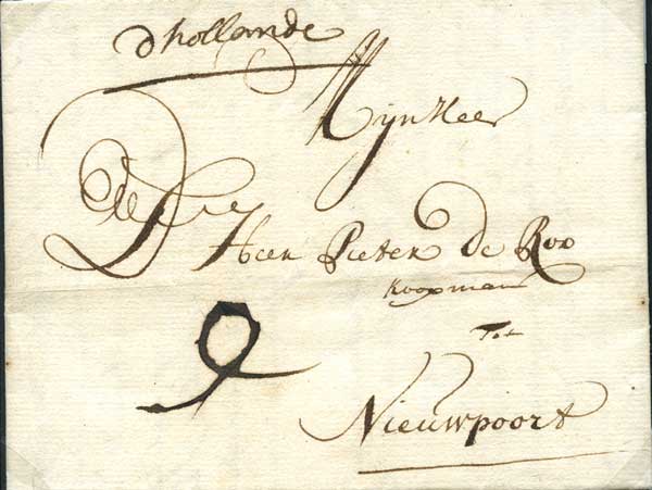 1724- Pli du 24 mai d'Amsterdam (griffe d'Hollande) vers Nieuwpoort via Anvers. Port: "9" (stuivers). Superbe. |