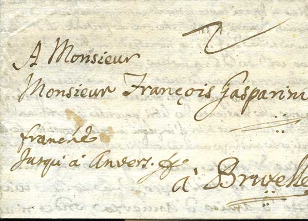 1729- Pli du 15 oct. de Venezia à Bruxelles via Anvers avec inscription "franche jusqu'à Anvers". Port: "2" (stuivers) d'Anvers à Bruxelles. Superbe. |