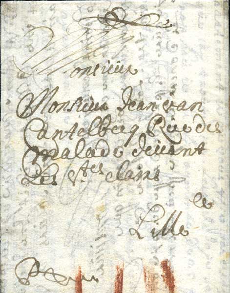 1695- Pli de "Lille 28 août" à destination d'Anvers avec descriptif de l'adresse "op de minebrours rij". port: d8 (8 deniers). Superbe. |