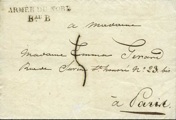 1832- Lettre du 11 déc. de Stabroek à Paris avec griffe "Armée du Nord/Bau. B.". Port de "5" au tampon. Texte intéressant... "...nous sommes en observation contre l'armée de terre hollandaise". Superbe. |