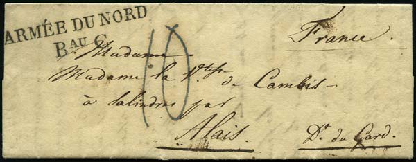 1832- Lettre datée sur 2 jours, 23 et 24 déc. de Wijnegem à dest. de Alais (FR) avec griffe "Armée du Nord Bau. C" (magnifiquement frappée). Port de "10" déc. Texte historique concernant les derniers jours de la citadelle d'Anvers. Exceptionnel. |