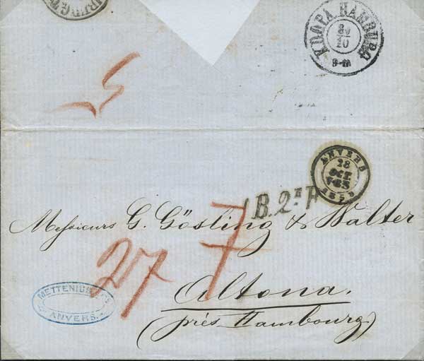1859- Lettre du 28 oct. d'Anvers vers Altona (Danemark jusqu'en 1867) par Hambourg (transit au verso) "B 2E R" avec explicatifs des différents ports. TB. |