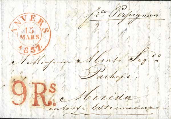 1837- Lettre de 15 mars d'Anvers à Merida avec mention manuscrite "frco Perpignan". Port au verso: "5/17", soit "22" déc. et au recto au tampon "9 Rs" (9 reales). Superbe. |