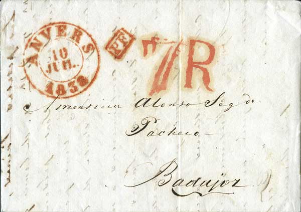 1838- Lettre du 10 juillet d'Anvers à Badajoz (Espagne) avec mention en rouge "PF" (port frontière) et au recto, port: "7R" (Esp.) et au verso, port de "16" déc. (Belg. + Fr.). Superbe. |