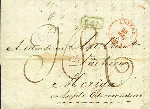 1843- Lettre du 26 nov. d'Anvers à Merida avec en vert "B4R" et grand "9R" à la main pour le port espagnol. Superbe. |