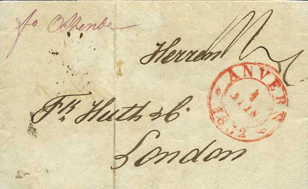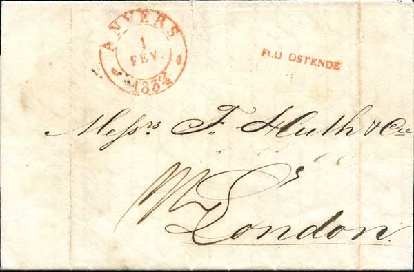 1834- Lettre du 4 fév. d'Anvers à Londres avec griffe "Fco Ostende" en rouge. Port: "40" au verso. Superbe. |