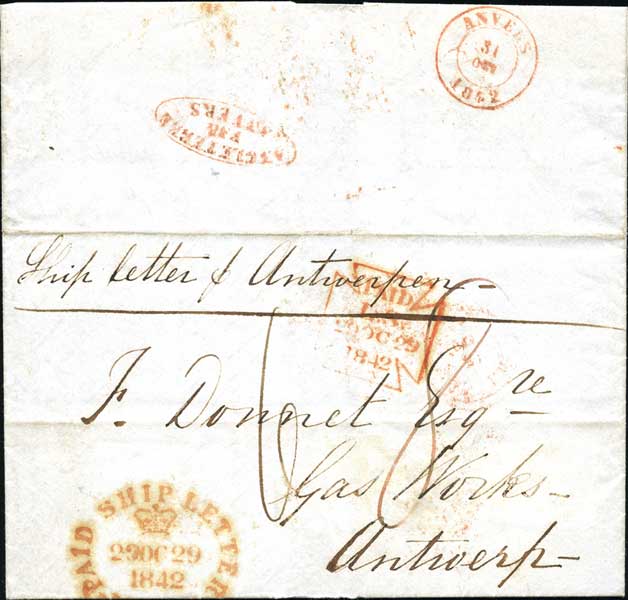 1842- Pli du 29 oct. de Londres à Anvers avec cachet "ShipLetter Paid" de Londres et marque d'entrée "Angleterre par Anvers" dans un ovale. Port: "8" pence et "6" déc. Superbe. |