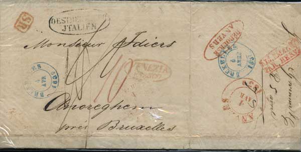 1839- Lettre du 26 mars de Trieste vers Audergem (Bruxelles) par "Venezia Franco", "Allemagne par Herve", par erreur vers Anvers, "Déboursé Anvers" et arrivée à Audergem par "SR" (service rural). Explicatifs des différents ports. Rare et TB. |