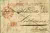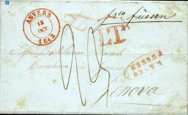 1842- Lettre du 15 oct. d'Anvers à Genova (Italie) avec mention man. "Frco Füssen" + griffe ovale, griffe "LT" (Lettera di transito), "23" soldi avec explicatifs. Superbe. |