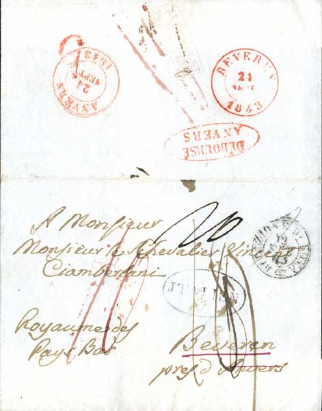 1843- Lettre du 12 sept. de Rome à Beveren via Antwerpen avec griffe ovale de Cologne: "Italien" et griffe ovale "Déboursé Anvers" + différents ports avec explicatifs. Superbe. |