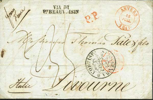 1847- Lettre du 15 juillet d'Anvers à Livourne via Torino avec griffe "Via Di / Pt. Beauvoisin" et cachet de passage "PP" de Gènes. TB. |