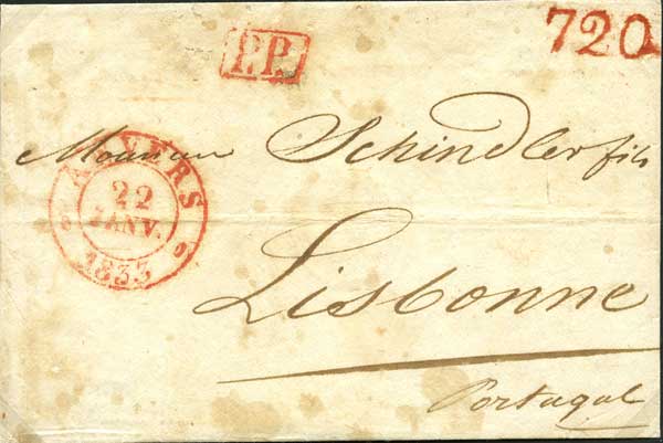 1833- Lettre du 22 janv. d'Anvers à Lisbonne avec port au tampon de "720" reis. Superbe. |