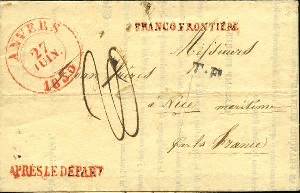 1835- Lettre du 27 juin d'Anvers à Nice (Sardaigne). Griffes "Franco Frontière", "Après le départ", "TF" (transit français) et "20" soldi. Incisions sanitaires dans l'enveloppe. Superbe. |