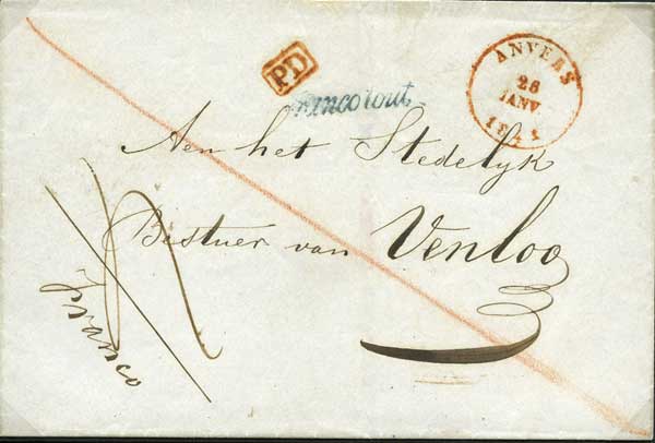 1841- Lettre du 26 janv. d'Anvers à Venloo (P-B), griffe en bleu de Maastricht "Francotout" (vdl 1512). TB. |
