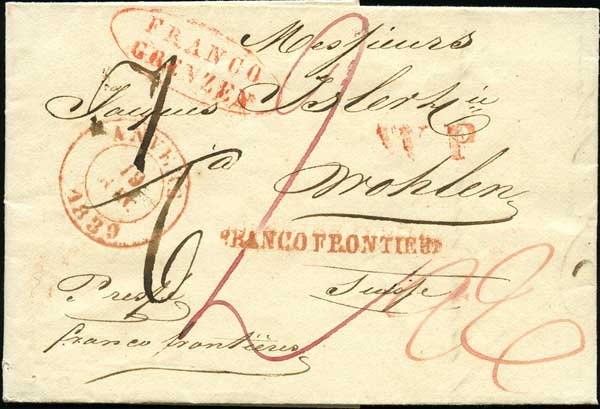 1839- Lettre du 19 juin d'Anvers à Wohlen (CH) via la Prusse avec griffe "Franco Frontière" (d'Anvers), "Franco Grenzen" (de Liège) et "WP" (Karlsruhe). Explicatifs des ports recto-verso. Superbe. |