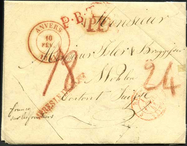 1841- Lettre du 10 fév. d'Anvers à Wohlen (CH) via la France. En man. "franco sur les frontières" + griffe "PP" , "PBTF" (Pays-Bas Transit France) + explicatifs des différents ports. Superbe. |